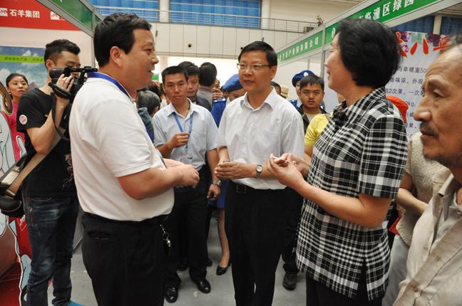 省政協(xié)副主席馮月菊(右一)、陜西省商務廳廳長姚超英(右二)等領導介紹石羊集團參展的產品.