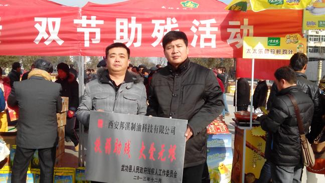為表達石羊“邦淇人”對武功2.8萬殘疾人的關(guān)愛之情,元月1日到3日,邦淇小包總公司聯(lián)合武功縣殘疾人聯(lián)合會、陜通配送中心在縣中心廣場聯(lián)合舉辦“扶弱助殘獻愛心、饋贈武功眾鄉(xiāng)親”活動,此次活動得到了油脂事業(yè)部王曉勇副總經(jīng)理的大力支持,公司提供邦淇1.8L一豆300余桶、價值5000元,現(xiàn)場給重度殘疾人代表免費發(fā)放。武功殘聯(lián)理事長秦喜、邦淇小包西區(qū)總經(jīng)理張帆、陜通配送中心經(jīng)理何凱及市場部有關(guān)人員共同參加。張總代表公司發(fā)表了熱情洋溢致辭,他首先感謝武功父老長期對“邦淇”的支持,然后簡要介紹了集團及油脂產(chǎn)業(yè)的基本情況,最后表達了對武功殘疾人朋友的深切關(guān)愛,博得了現(xiàn)場群眾的由衷稱贊。在熱烈的掌聲中,殘聯(lián)領(lǐng)導(dǎo)將一面寫有“扶弱助殘、大愛無垠”的銅牌授予邦淇公司。