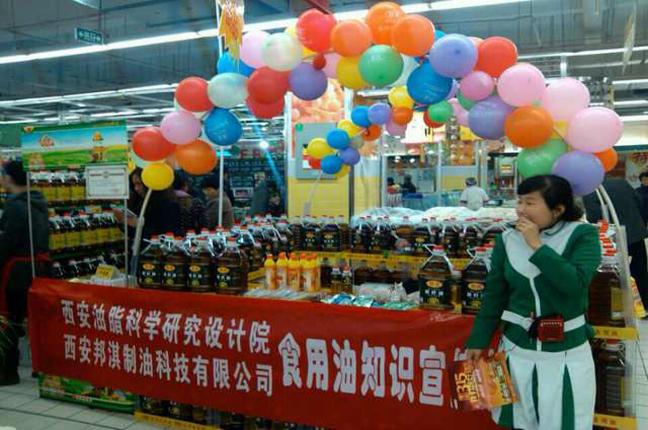 這次推廣,油脂產(chǎn)業(yè)以邦淇獲“2013陜西顧客滿意度測評食用油行業(yè)最佳顧客滿意獎”殊榮為契機,高度重視、精心組織、全員參與,以“您的健康、我的牽掛”為主題,貫穿“誠信、責任、擔當”;體現(xiàn)“綠色、安全、科普”,為更好指導科學消費,特意邀請石羊油脂產(chǎn)業(yè)戰(zhàn)略合作伙伴——西安油脂科學研究設計院有關(guān)專家全程參與西安的全部活動,接受消費者現(xiàn)場咨詢、舉辦油品知識講座、指導食用油鑒別常識,重點是結(jié)合石羊油品安全、綠色、健康的價值理念進行宣講,西安KA分別在華潤渭濱路店、人人樂玉祥門店舉行,兩天達成銷量180桶;社區(qū)分別在大明宮西鐵小區(qū)、鳳城六路菁華名門、乾唐華府舉行,兩天實現(xiàn)銷售100余桶,通過空桶優(yōu)惠、贈送防霧霾口罩等形式,對邦淇特別是石羊品牌的傳播意義深遠。