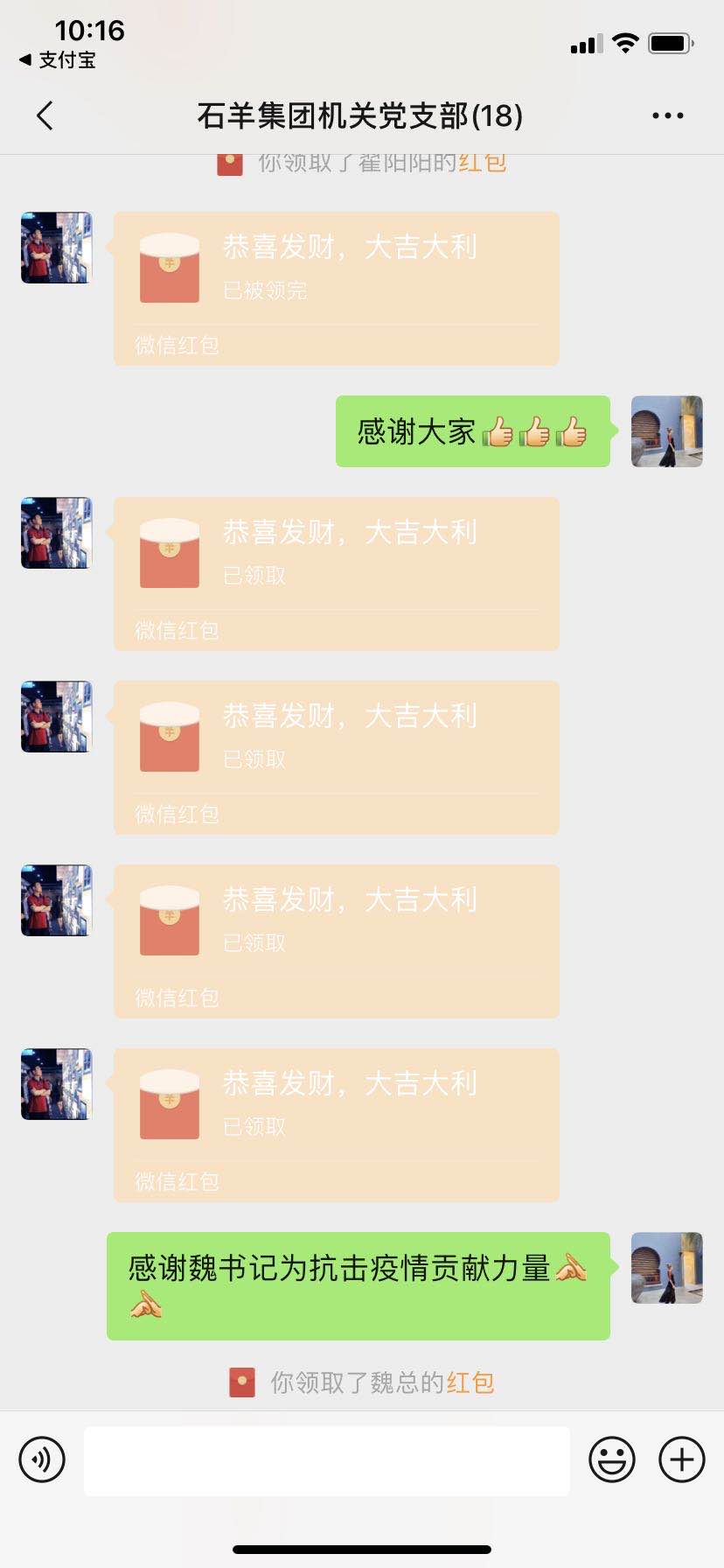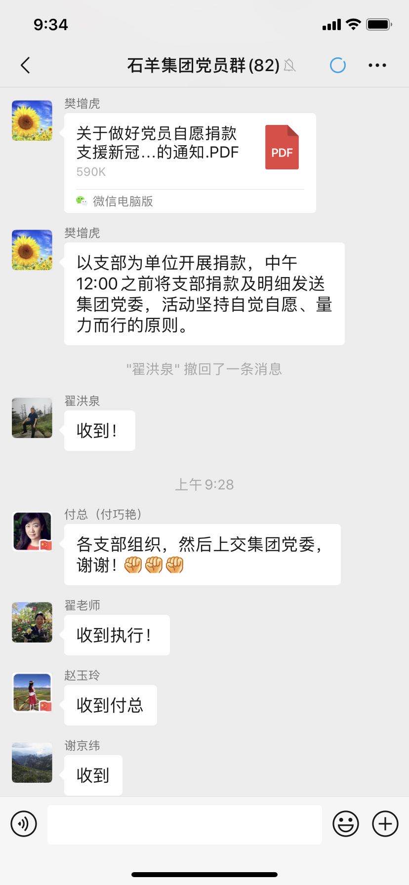 疫情就是命令,防控就是責任。危難時刻,共產(chǎn)黨員就應該沖鋒在前。2月28日上午,石羊集團黨委下發(fā)《關(guān)于做好黨員自愿捐款支援新冠疫情防控工作的通知》,通知發(fā)出后,全體黨員和入黨積極分子踴躍響應,積極行動自愿繳納這份“特殊黨費”,為疫情防控貢獻力量,踐行石羊愛心和擔當。