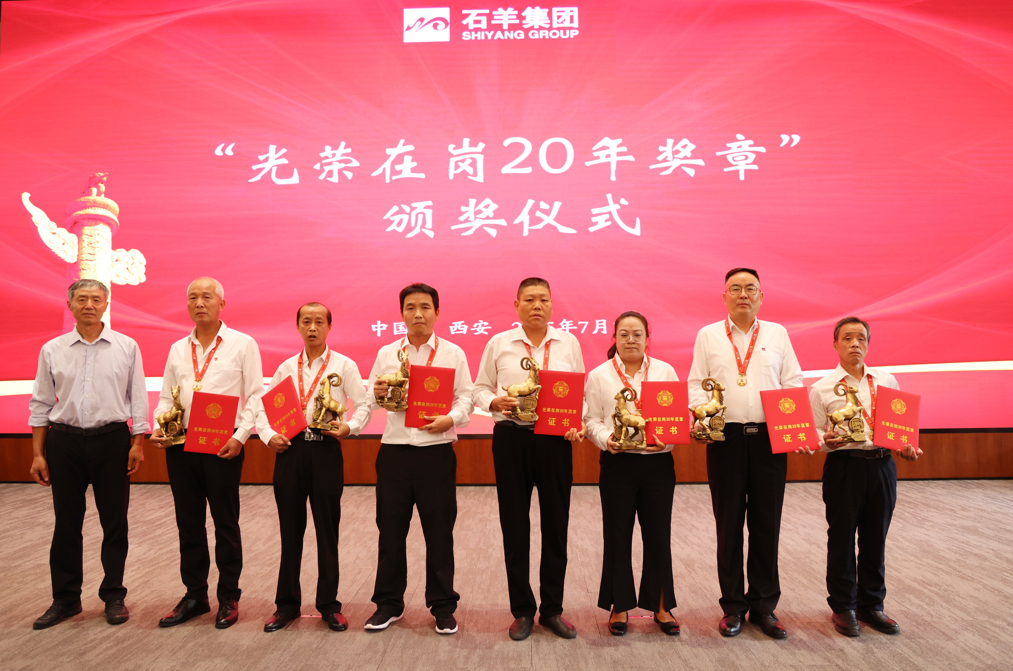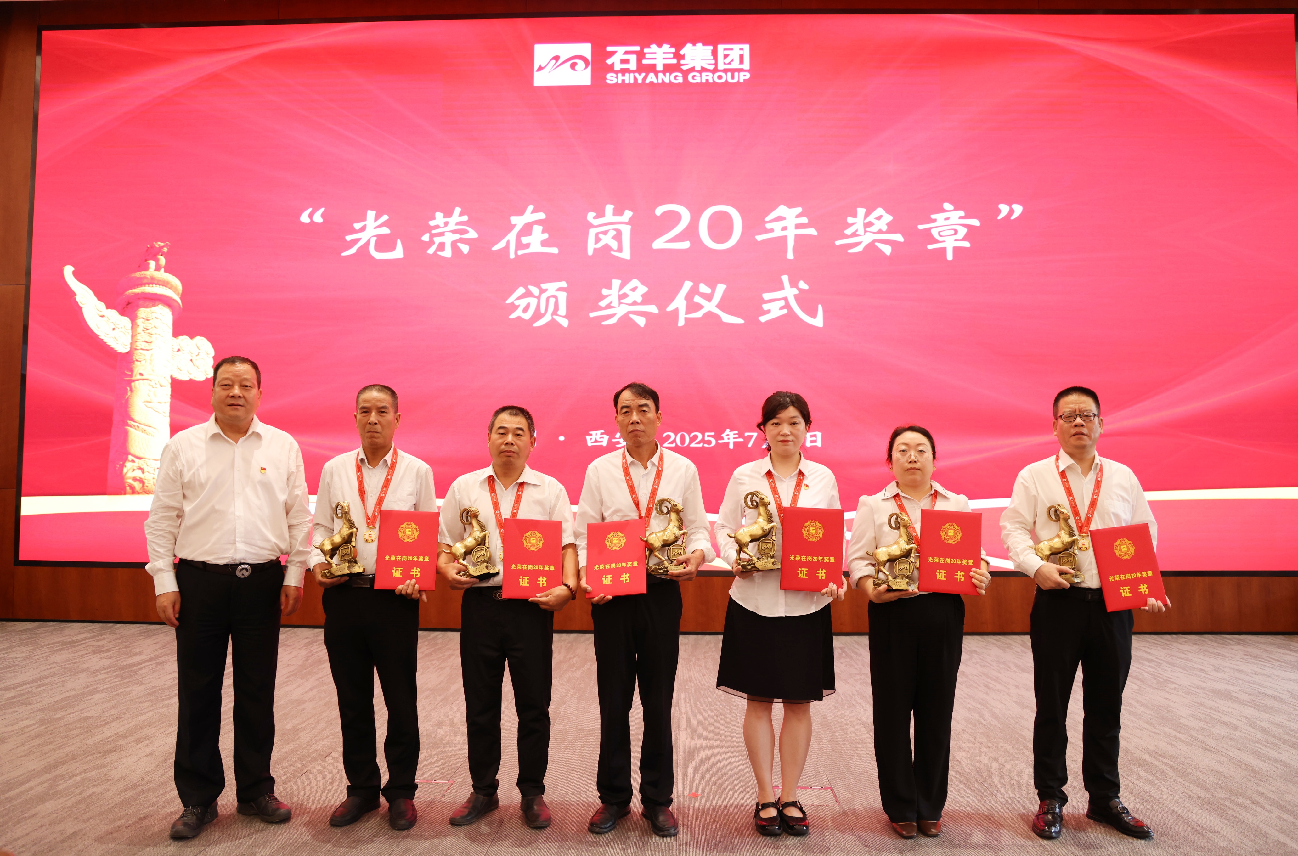 接下來,對在崗二十年員工進(jìn)行表彰,頒發(fā)“光榮在崗20年獎?wù)?rdquo;。20年相伴相隨,石羊人將青春與熱血融入企業(yè)發(fā)展歷程,在各自崗位上默默耕耘、無私奉獻(xiàn)。當(dāng)沉甸甸的獎?wù)聮煸谛厍?,閃耀的不僅是榮譽的光芒,更是他們20年如一日堅守與付出的見證,贏得了全場熱烈的掌聲與由衷的敬意。